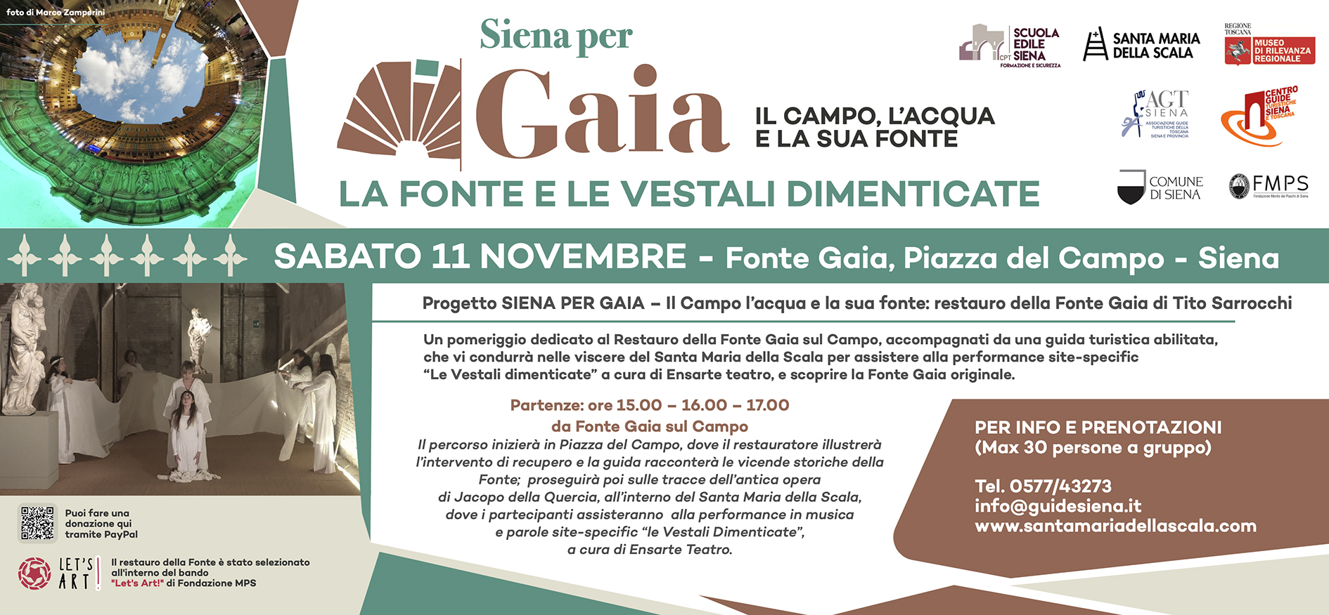Sabato 11 Novembre, un pomeriggio dedicato al Restauro della Fonte Gaia sul Campo, accompagnati da una guida turistica abilitata, che vi condurrà nelle viscere del Santa Maria della Scana per assiste alla performance site-specific "Le Vestali Dimenticate" a cura di Ensorte Teatro e scoprire la Fonte Gaia originale.