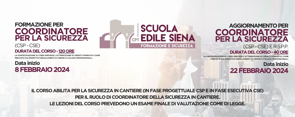 La Scuola Edile di Siena organizza, a partire da Giovedì 08 Febbraio 2024 un corso per Coordinatore per la Sicurezza (CSP-CSE) di 120 Ore e una serie di eventi suddivisi in moduli di ore 4 valevoli come Aggiornamenti Coordinatore per la Sicurezza e R.S.P.P. a partire da Giovedì 22 Febbraio 2024.